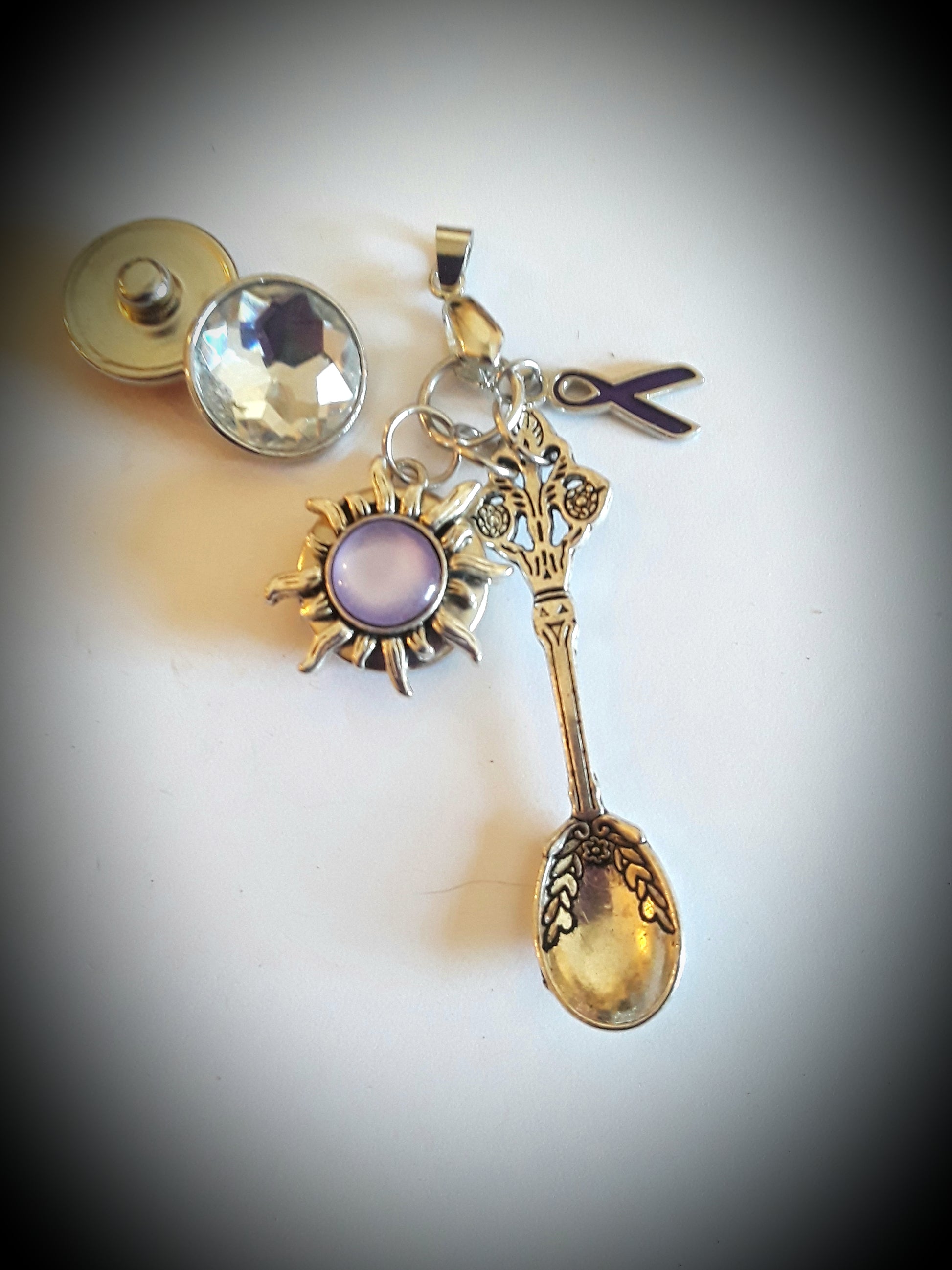 Have you heard of the spoon theory? Help show your support of spoonies with this beautiful 18mm NoosaSnaps pendant with a hanging spoon, purple butterfly, and purple awareness ribbon. Comes with snap shown. Choose from hundreds of noosasnaps to match any outfit and style!