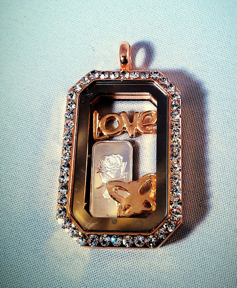 A story locket with rinestones, a stamped silver gram with a rose, love, and butterfly